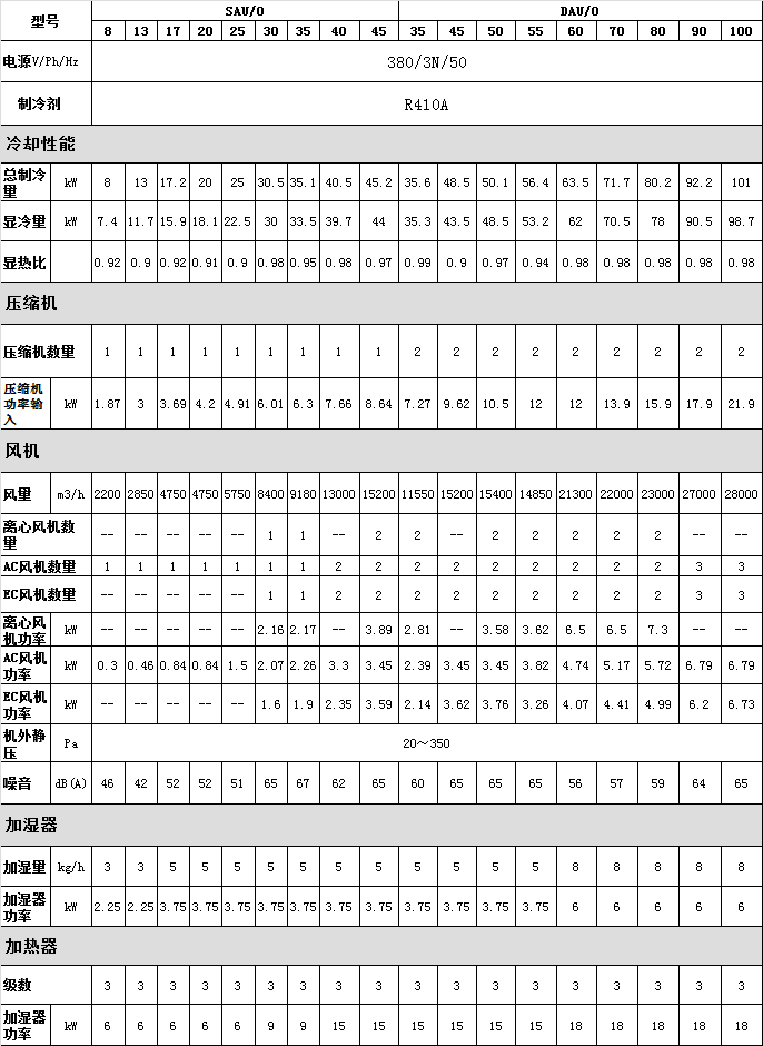 (4)- 表格中電加熱量與加濕量為標(biāo)準(zhǔn)配置,如客戶需要增大機組加熱或加濕能力,請咨詢我公司。