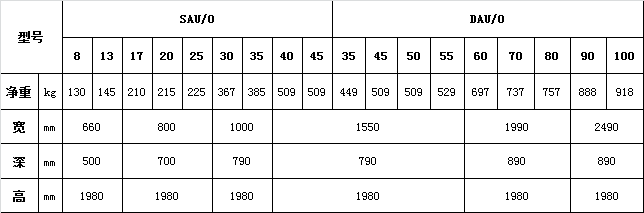 注:表格中機組DAU/O 060 070 080尺寸為配置EC和AC風(fēng)機時的尺寸,機組配置皮帶輪風(fēng)機時,機組尺寸為2100mm *790mm *1980mm。