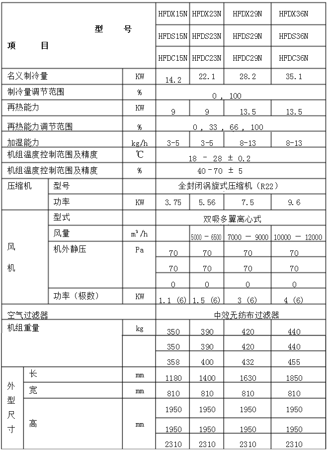 注: ·制冷量數(shù)據(jù)為機組吸入空氣干球溫度24℃,相對濕度50%,室外空氣干球溫度35℃時的值;