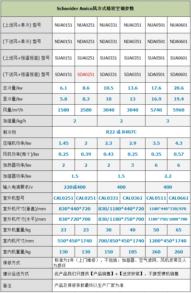 優(yōu)力Uniflair Amico SDA0251 風冷精密空調(diào)產(chǎn)品主要功能 1 適合機房24小時不停制冷運作環(huán)境 2 提供多種送風方式及制冷模式選擇,適合任何環(huán)境使用 詳細參數(shù) 品牌:Schneider施耐德 產(chǎn)品:機房精密空調(diào) 制式:風冷式 系列:Amico