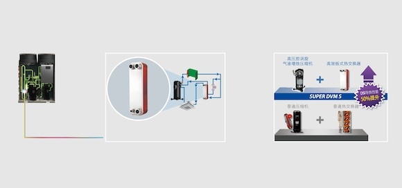 Hybrid混合型高效換熱器可實(shí)現(xiàn)冷媒過(guò)冷卻,提高循環(huán)換熱效率。同時(shí),SUPER DVM S還采用了結(jié)構(gòu)緊湊,換熱高效的板式換熱器作為過(guò)冷卻器,實(shí)現(xiàn)進(jìn)一步二級(jí)過(guò)冷卻,減少冷媒在管道中流動(dòng)時(shí)的壓力損失,進(jìn)一步提升系統(tǒng)性能。