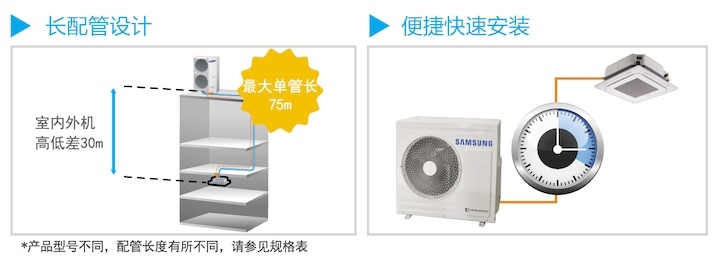 CAC產(chǎn)品最大單管長可達75米,室外機落差30米,大幅度提升設(shè)備擺放的自由度。同時室內(nèi)外機通過銅管連接,簡單快捷,有效縮短施工周期。