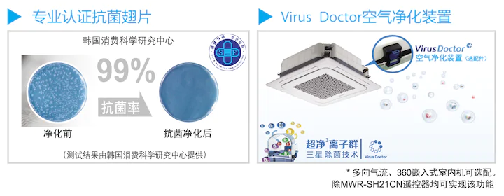 三星空調(diào)室內(nèi)機翅片經(jīng)抗菌處理,可有效抑制有害菌滋生,具有優(yōu)越的抗菌防霉性能。還可選配Virus Doctor空氣凈化裝置,與空氣中有害物質(zhì)進行中和反應,創(chuàng)造舒適健康的生活空間。